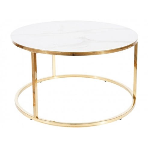 Podstawa mebla wykonana jest z metalu, którego powierzchnię ozdobiono złotym lakierem. Trzy proste nogi wychodzące od stelaża łączą się w podstawie, tworząc elegancki okrąg. Wewnątrz tego złotego pierścienia umieszczony jest okrągły blat z hartowanego szkła, imitującego biały marmur. Efekt ten prezentuje się niezwykle oryginalnie i nadaje meblowi prestiżowego charakteru.