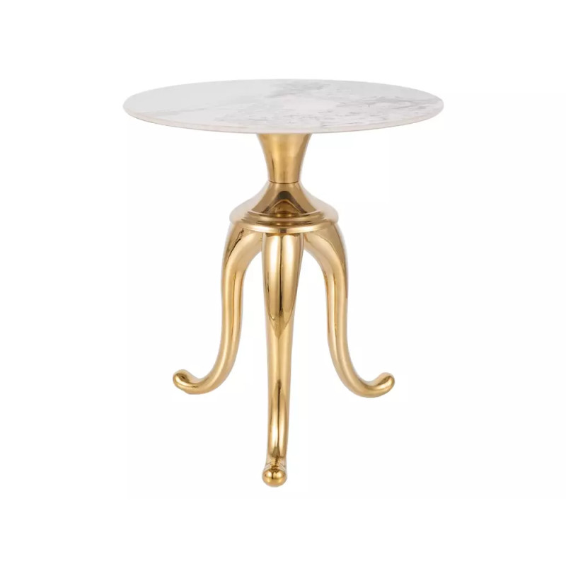 Ława Snake to efektowny, nowoczesny stolik łączący elegancję marmurowego wykończenia z luksusowym akcentem złotej stali nierdzewnej. Okrągły blat w kolorze biały połysk z subtelnym efektem marmuru nadaje meblowi wyjątkowego charakteru, a stabilny metalowy stelaż w odcieniu złota podkreśla jego ekskluzywny wygląd. Ława świetnie sprawdzi się w salonach urządzonych w stylu glamour, nowoczesnym lub eklektycznym.