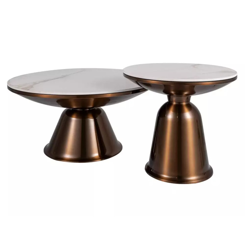 Zestaw ław Vera to luksusowe połączenie marmurowej ceramiki z dekoracyjnym stelażem w miedzianym połysku. Duży okrągły blat w białym połysku z wyraźnym efektem marmuru nadaje całości elegancji, a stal nierdzewna w odcieniu miedzi podkreśla nowoczesny i wyrafinowany charakter mebla. W skład zestawu wchodzą dwa stoliki o różnych wymiarach, które można ustawiać razem lub osobno, tworząc funkcjonalną i stylową aranżację salonu.