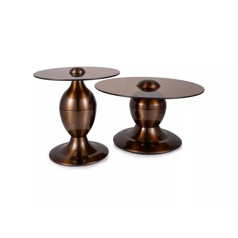 Zestaw ław Cassie to luksusowe połączenie szklanego blatu o transparentnym brązowym odcieniu z dekoracyjnym stelażem wykonanym ze stali nierdzewnej w kolorze miedzianego połysku. Okrągła forma stolików nadaje im szyku i lekkości, a wysokiej jakości materiały gwarantują trwałość oraz elegancki wygląd przez lata. Zestaw doskonale sprawdzi się w nowoczesnych salonach, wnętrzach glamour oraz przestrzeniach premium.