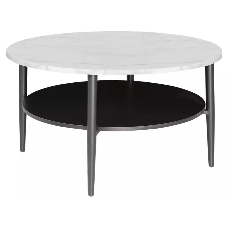 Ława Ella A to nowoczesny stolik kawowy, który łączy w sobie elegancję marmurowego wzoru z minimalistycznym, czarnym stelażem. Okrągły blat wykonany z płyty laminowanej w kolorze białym z efektem marmuru prezentuje się stylowo i lekko, a metalowy stelaż w czarnym odcieniu nadaje całości stabilności i wyrazistego charakteru. Ława doskonale sprawdzi się we wnętrzach modern, glamour oraz skandynawskich.