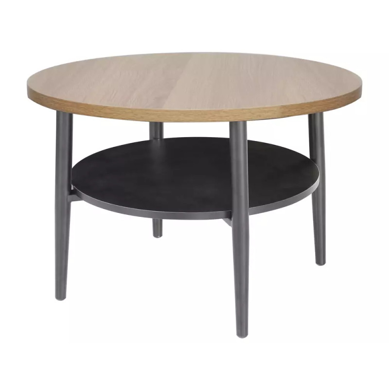 Ława Ella B to elegancki, kompaktowy stolik kawowy, który łączy naturalny wygląd blatu w kolorze dąb z minimalistycznym czarnym stelażem. Okrągły blat z płyty laminowanej wiernie imituje strukturę drewna, wprowadzając do wnętrza ciepło i przytulny klimat. Metalowy stelaż w czerni nadaje meblowi nowoczesnego, uniwersalnego charakteru, dzięki czemu ława doskonale sprawdzi się w aranżacjach loftowych, skandynawskich, modern oraz naturalnych.