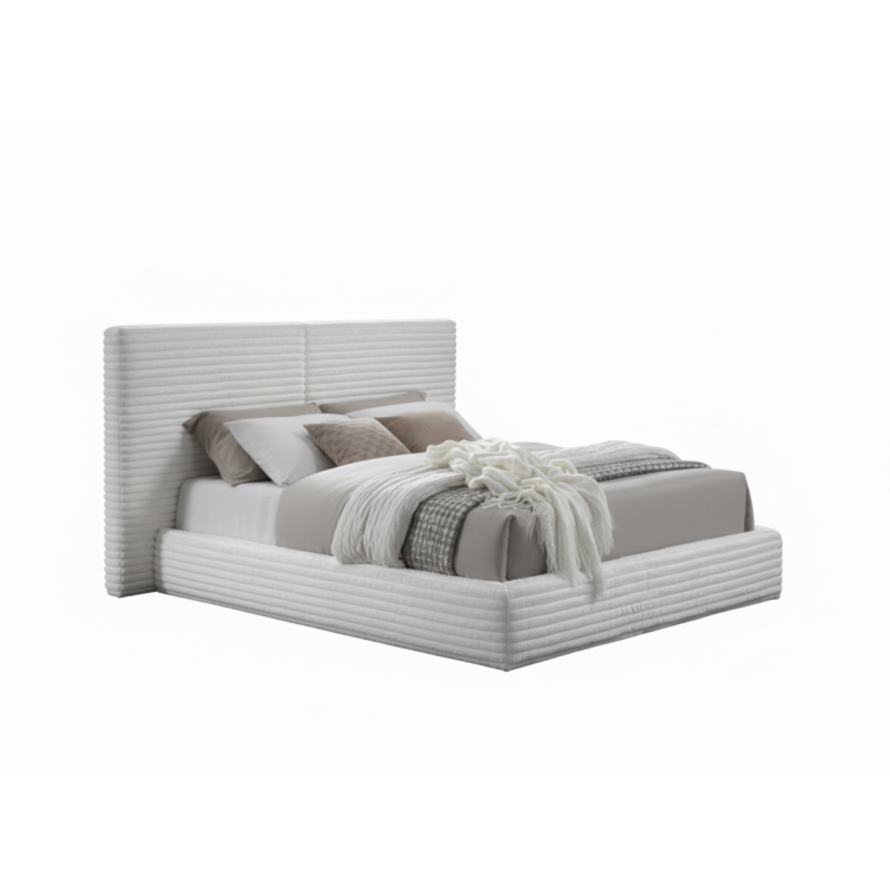 ✅ Elegancki, wysoki zagłówek. ✅ Styl glamour pasujący do nowoczesnych sypialni. ✅ Jasna kolorystyka rozświetlająca wnętrze. ✅ Komfortowa powierzchnia spania 160×200 cm. ✅ Efektowny design bez zbędnych dodatków.