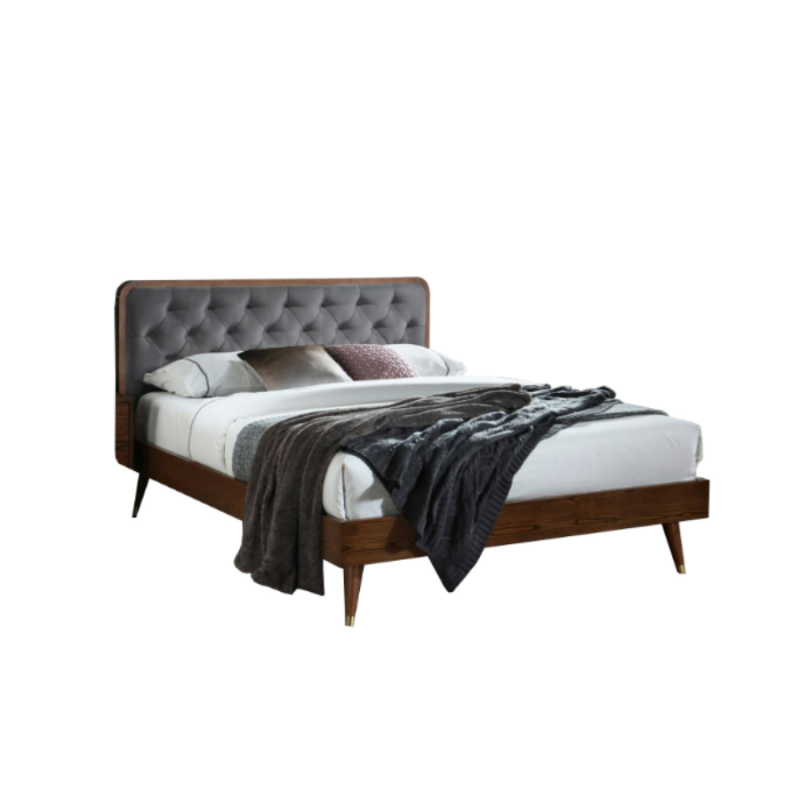 Łóżko CREMA 160x200 z pikowanym zagłówkiem na drewnianych nóżkach szare/orzech.