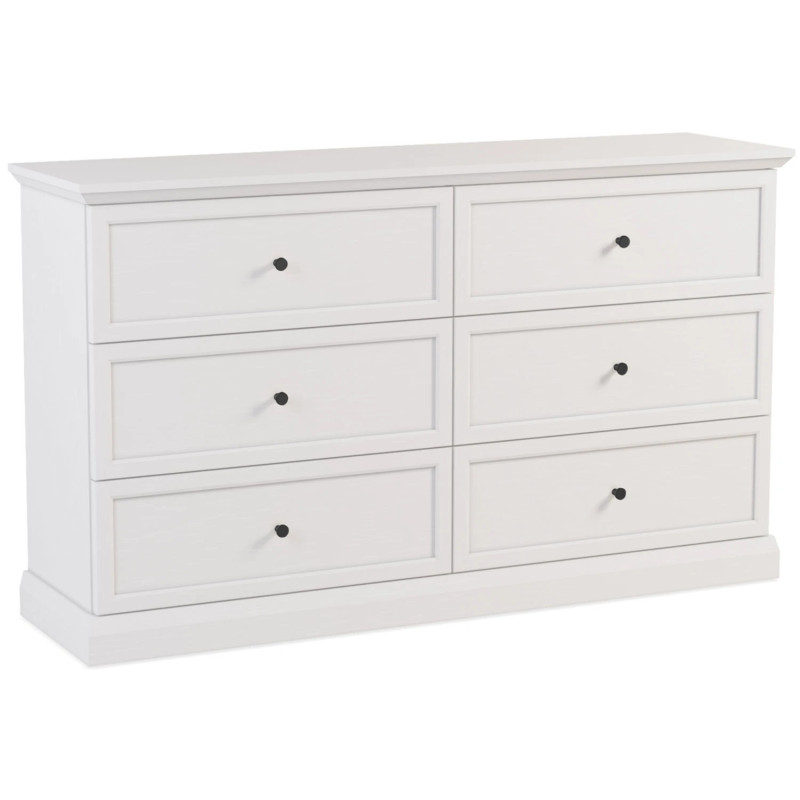 Komoda Lucca K6S w kolorze białym to elegancki i funkcjonalny mebel, który doskonale wpasuje się w nowoczesne i klasyczne wnętrza. Wykonana z wysokiej jakości płyty laminowanej, charakteryzuje się odpornością na uszkodzenia mechaniczne, co zapewnia jej trwałość i estetyczny wygląd przez długi czas.