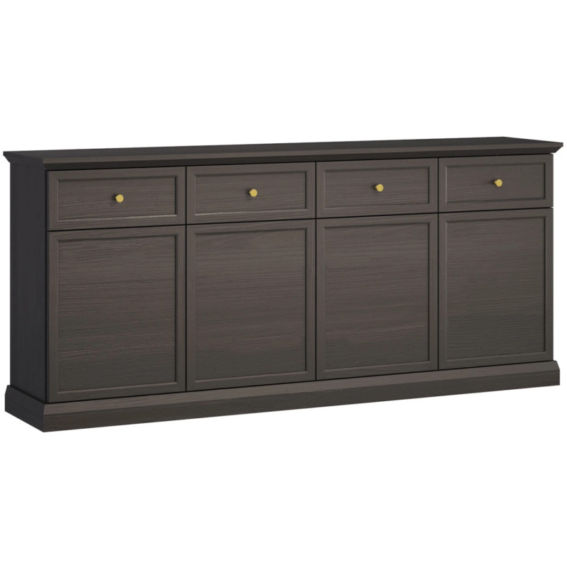 Komoda wyposażona jest w cztery pojemne szuflady oraz cztery zamykane fronty, idealne do przechowywania odzieży, dokumentów czy innych domowych akcesoriów. Klasyczne metalowe uchwyty w kolorze szlachetnego złota dodają jej elegancji i ułatwiają codzienne użytkowanie. Bogato zdobione korony i cokoły podkreślają stylowy charakter mebla, a duża powierzchnia blatu oferuje dodatkowe miejsce na dekoracje czy sprzęt elektroniczny.