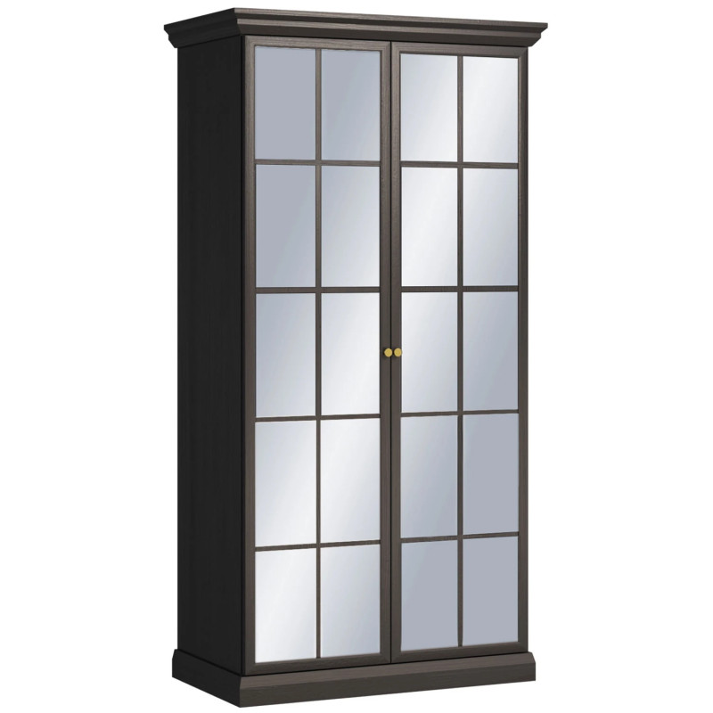 Szafa wyposażona jest w przestronną przestrzeń do przechowywania odzieży, z dwoma drzwiami i lustrzanymi frontami, które optycznie powiększają przestrzeń. Dodatkowo, ozdobne listwy MDF oraz solidny cokół o wysokości 86 mm podkreślają jej stylowy charakter. Mebel posiada klasyczne metalowe uchwyty w kolorze szlachetnego złota, które dodają elegancji i ułatwiają codzienne użytkowanie.