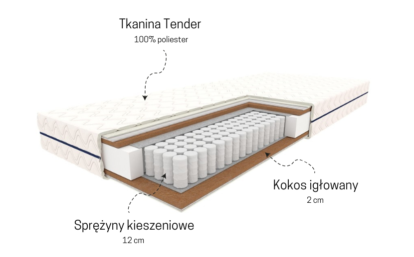 - maty kokosowe poprawiające wentylację wewnątrz materaca oraz zwiększające jego twardość i żywotność