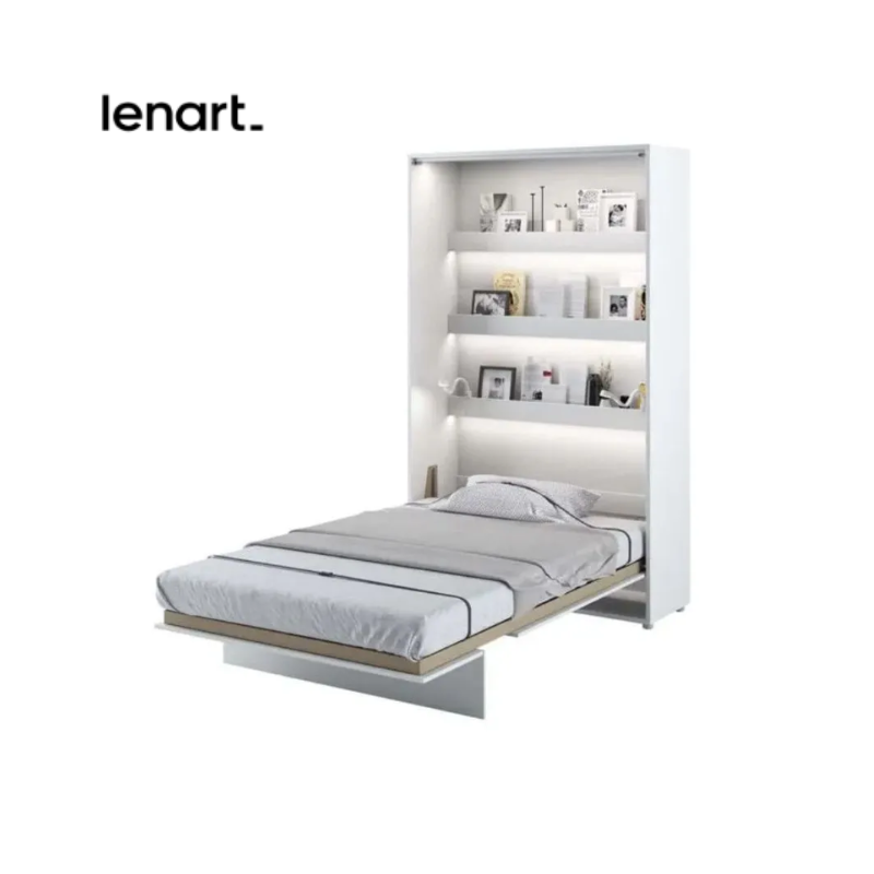 Półkotapczan Bed Concept BC-02 od marki Lenart to mebel, który oferuje wiele udogodnień w codziennym życiu. W pionowej wersji półkotapczanu dostępnych jest pięć szerokości materacy: 90x200; 120x200; 140x200; 160x200; 180x200, dzięki czemu każdy może znaleźć odpowiednią wersję dopasowaną do swoich potrzeb. Mebel ten wyposażony jest w wewnętrzne półki, które można wykorzystać na przechowywanie książek lub niezbędnych przedmiotów. Wnętrze półkotapczanu zawiera również pasy spinające pościel, które pozwalają na uniknięcie codziennego ścielenia łóżka; metalową ramę ze stelażem szczebelkowym, do której wystarczy dokupić odpowiedni materac.