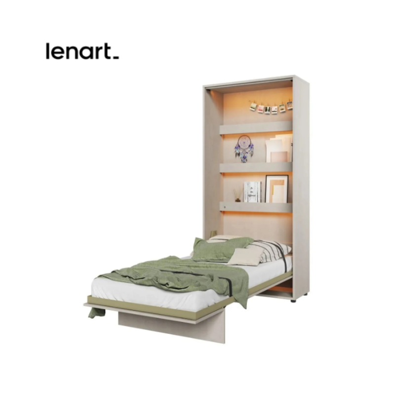 Półkotapczan Bed Concept od marki Lenart ma do zaoferowania mebel, który spełnia wiele udogodnień w życiu codziennym. Półkotapczan został wyposażony w wewnętrzne półki, które możesz zagospodarować pod książki, bądź niezbędne Ci rzeczy. We wnętrzu znajdziemy również pasy spinające pościel, które pozwolą na nieścielenie łóżka; metalową ramę ze szczebelkowym stelażem do którego wystarczy dokupić odpowiedni materac.