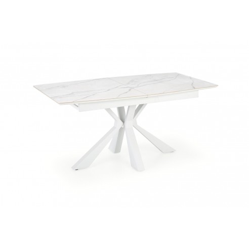 Blat stołu, o wymiarach 160-200/89 cm, wykonany jest z trwałego spieku oraz MDF lakierowanego, imitującego piękny biały marmur. To połączenie materiałów gwarantuje zarówno estetykę, jak i łatwość utrzymania w czystości. Prostokątny kształt blatu sprawia, że stół doskonale wpisuje się w nowoczesne trendy, a opcja rozkładania umożliwia dostosowanie go do liczby gości.