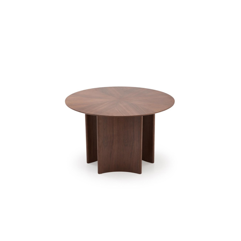Blat wykonany z płyty MDF pokrytej naturalną okleiną orzechową wyróżnia się eleganckim wyglądem i trwałością. Charakterystycznym elementem stołu są trzy efektownie wygięte nogi, które nadają konstrukcji lekkości wizualnej, a jednocześnie zapewniają stabilność. Jednolita, orzechowa kolorystyka podkreśla naturalny charakter mebla i wprowadza do wnętrza przytulną atmosferę.