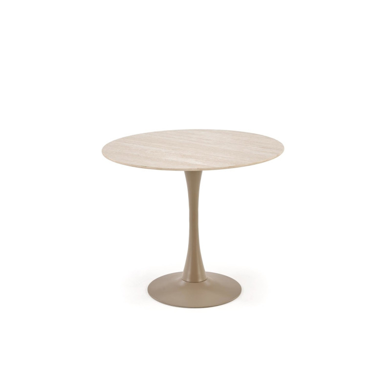 Centralna, kieliszkowata noga z metalu malowanego proszkowo w kolorze kaszmiru nadaje konstrukcji wizualnej lekkości, a jednocześnie zapewnia stabilność i komfort użytkowania. Subtelna, beżowa kolorystyka doskonale wpisuje się w jasne, nowoczesne aranżacje.