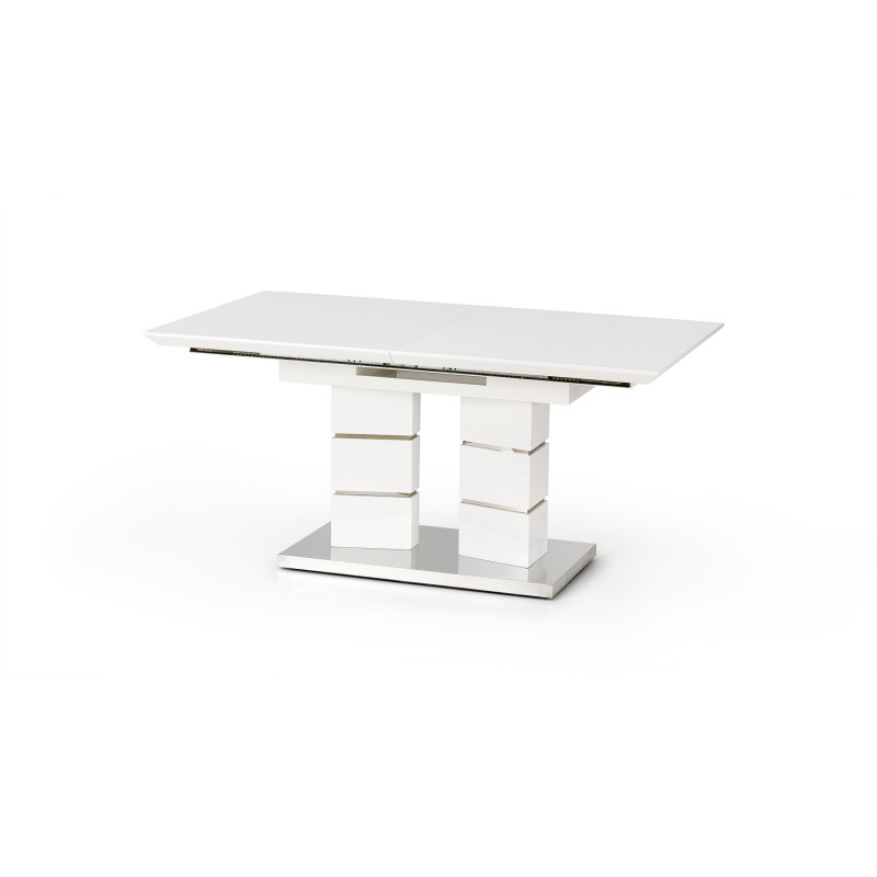 Jego nowoczesna forma skradnie serce nawet najbardziej wymagających Domowników. Duży, rozkładany blat wykonany z płyty MDF, wybarwiony w subtelnej kolorystyce bieli w połączeniu z podstawą zdobioną elementami ze stali nierdzewnej, prezentuje się efektownie i modnie.