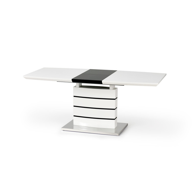 Stół Riven o rozmiarach 80x140(180) w kolorze biało-czarnym, produkcji firmy Dome, jest doskonałym rozwiązaniem zarówno do mniejszych, jak i większych pomieszczeń. Jego uniwersalne wymiary pozwalają na idealne dopasowanie do różnych przestrzeni. Przed rozłożeniem, stół ma długość 140 cm, a po rozłożeniu zwiększa się do 180 cm.
