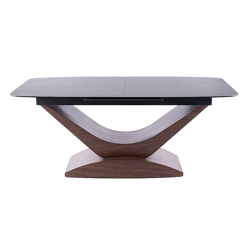 Blat stołu, wykonany ze szkła hartowanego oraz włoskiej ceramiki jest utrzymany w szarym marmurze, nadaje pomieszczeniu wyrafinowanego charakteru. Równocześnie dodatek brązowych elementów tworzy harmonijne zestawienie kolorystyczne, podkreślając finezję i styl mebla.