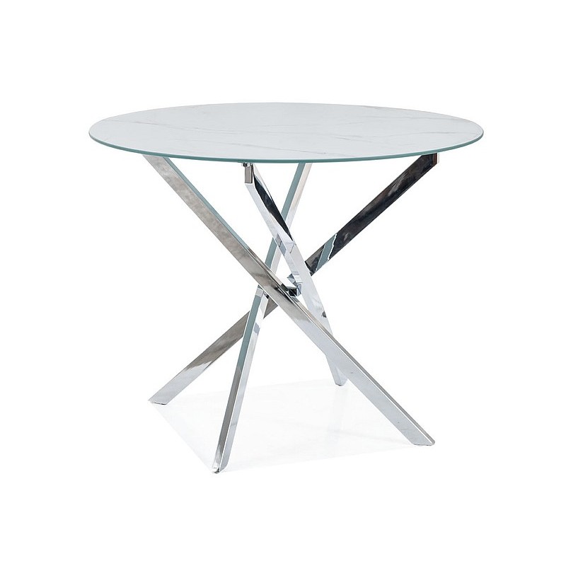 Blat stołu został starannie wykonany z trwałego szkła hartowanego dostępne w eleganckim odcieniu z efektem marmuru w połączeniu z chromowanymi nogami.
