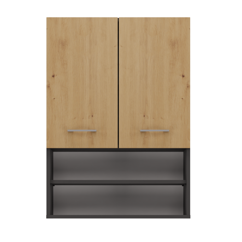 - Szafka posiada 2 półki otwarte oraz 2 schowane za drzwiami