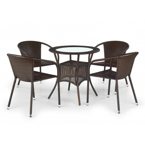 Blat stołu wykonany został z połączenia szkła i rattanu syntetycznego, co nadaje mu wyjątkowego charakteru i stylowego wyglądu. Wymiary blatu sprawiają, że jest to idealny wybór dla czteroosobowych spotkań na świeżym powietrzu.